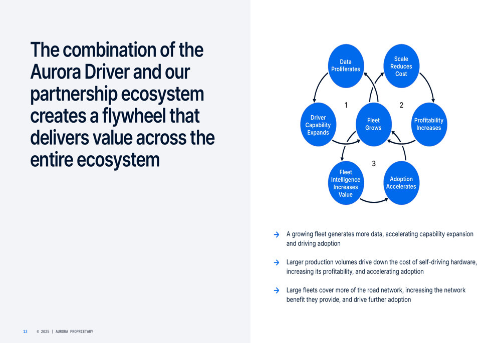 A Aurora também destacou seu modelo de negócios de "flywheel", onde o aumento da capacidade do motorista leva a mais coleta de dados, o que permite escala e redução de custos, impulsionando em última análise a lucratividade e adoção em um ciclo virtuoso.