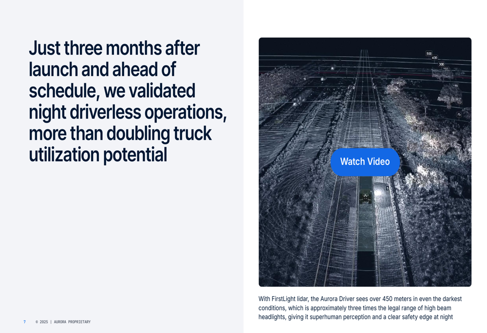 Uma conquista tecnológica significativa anunciada durante o trimestre foi a validação de operações noturnas sem motorista, que a Aurora completou antes do previsto. Esta capacidade efetivamente dobra a utilização potencial do caminhão ao permitir operações 24 horas. A tecnologia lidar FirstLight da empresa permite que o Aurora Driver veja mais de 450 metros na escuridão, aproximadamente três vezes o alcance legal dos faróis altos.