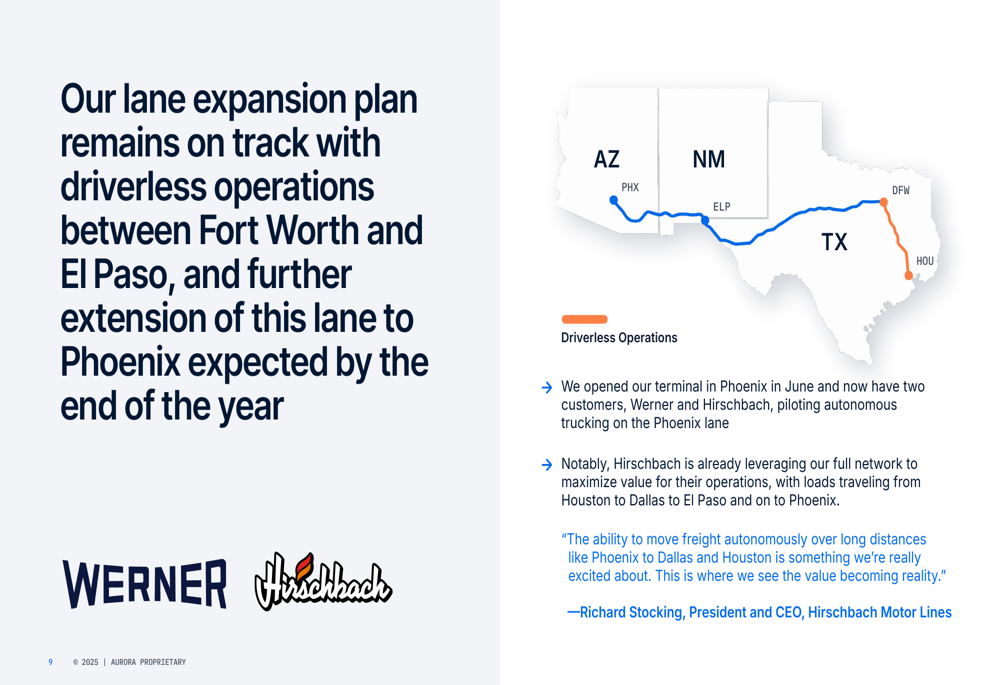 A Aurora também está expandindo sua rede de rotas, com operações entre Fort Worth e El Paso em andamento e planos para se estender até Phoenix até o final do ano. Esta expansão está sendo conduzida em parceria com clientes, incluindo Werner e Hirschbach. Richard Stocking, Presidente e CEO da Hirschbach Motor Lines, foi citado dizendo: "A capacidade de transportar cargas de forma autônoma em longas distâncias como Phoenix para Dallas e Houston é algo que nos deixa realmente empolgados. É aqui que vemos o valor se tornando realidade."