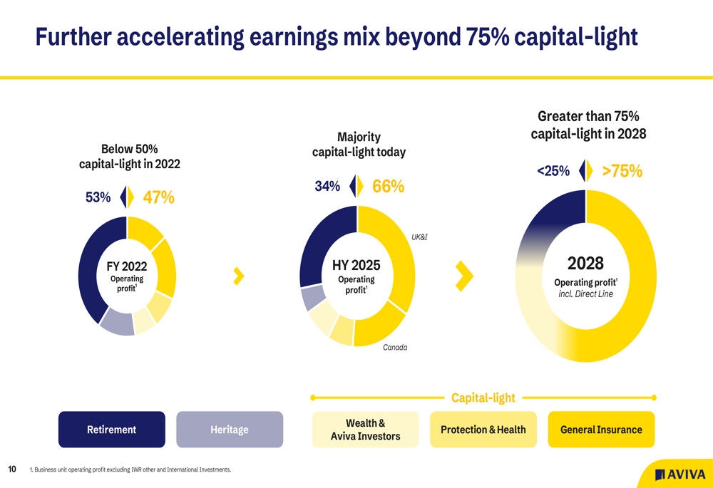 A Aviva está acelerando sua mudança para negócios de baixa intensidade de capital, visando que mais de 75% de seu mix de negócios seja de baixa intensidade de capital até 2028, comparado a menos de 50% em 2022. Esta mudança estratégica foi projetada para melhorar os retornos e reduzir a intensidade de capital.