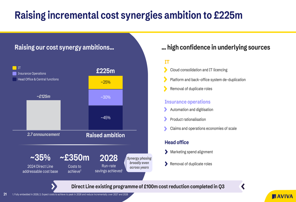 A aquisição da Direct Line fortaleceu a posição da Aviva no mercado de Linhas Pessoais do Reino Unido, criando um líder com um extenso portfólio de marcas reconhecidas. A entidade combinada atende mais de 21,7 milhões de clientes no Reino Unido, comparado aos 28 milhões do Lloyds Banking Group, 20 milhões do Barclays UK e 19 milhões do NatWest.