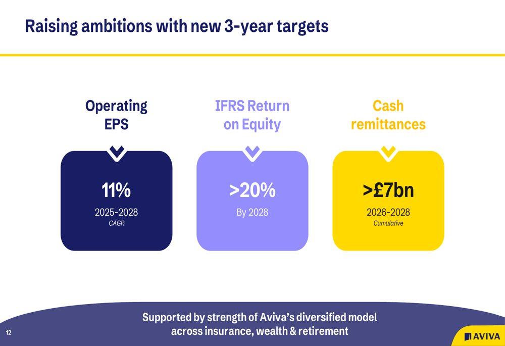A Aviva estabeleceu novas metas ambiciosas para três anos de 2025-2028, incluindo CAGR de LPA operacional de 11%, retorno sobre o patrimônio IFRS excedendo 20% até 2028, e remessas de caixa cumulativas de mais de £7 bilhões para 2026-2028.