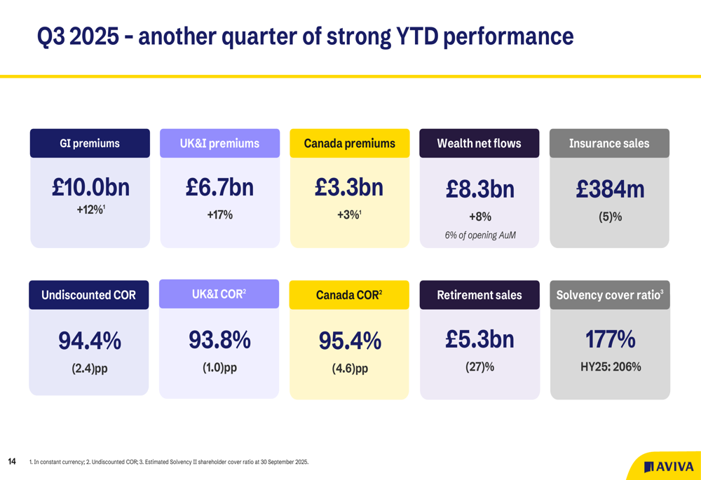 A Aviva reportou um robusto desempenho acumulado no 3º tri de 2025, com prêmios de seguro geral aumentando 12% para £10,0 bilhões, impulsionados pelo crescimento de 17% nos prêmios do Reino Unido e Irlanda (£6,7 bilhões) e 3% de crescimento no Canadá (£3,3 bilhões). O negócio de gestão de patrimônio da empresa gerou fluxos líquidos de £8,3 bilhões, representando um crescimento de 8% e 6% dos ativos sob gestão iniciais.