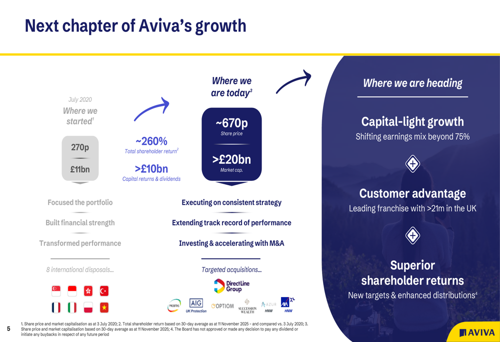 Desde julho de 2020, a Aviva transformou seu perfil de negócios, com o preço das ações crescendo de 270p para aproximadamente 670p e a capitalização de mercado expandindo de £11 bilhões para mais de £20 bilhões. Isso representa um retorno total aos acionistas de aproximadamente 260%, incluindo retornos de capital e dividendos excedendo £10 bilhões.