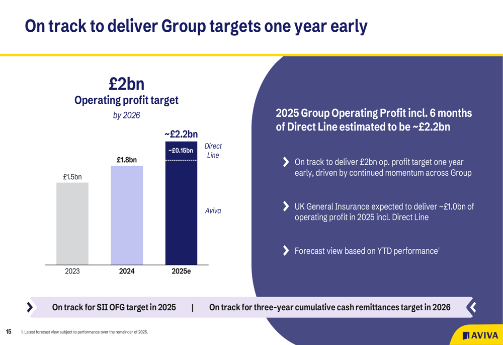 O lucro operacional da Aviva está a caminho de atingir aproximadamente £2,2 bilhões em 2025, incluindo cerca de £0,15 bilhão de seis meses de propriedade da Direct Line. Este desempenho coloca a empresa em posição de alcançar suas metas de 2026 um ano antes.