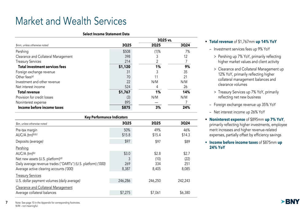 Serviços de Mercado e Patrimônio, que compreende Pershing, Compensação e Gestão de Garantias, e Serviços de Tesouraria, entregou desempenho ainda mais forte com receita total de US$ 1,77 bilhão, um aumento de 14% ano a ano. O lucro antes dos impostos aumentou 24% para US$ 875 milhões: