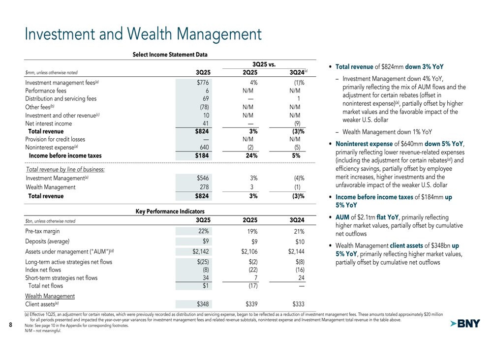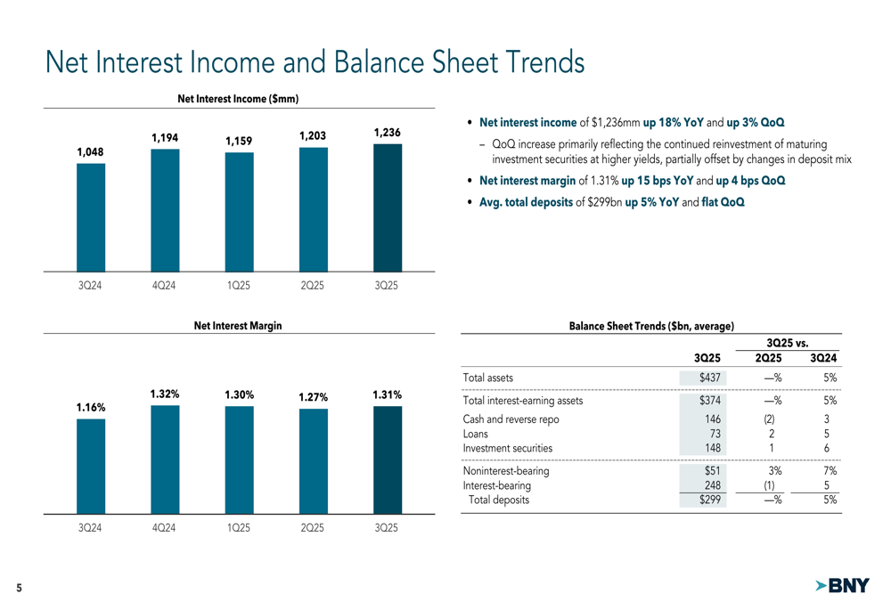 O BNY Mellon entregou resultados financeiros impressionantes para o 3º tri de 2025, com receita total alcançando US$ 5,1 bilhões, um aumento de 9% em comparação ao mesmo período do ano anterior. A empresa demonstrou gestão eficaz de despesas, com custos aumentando apenas 4% ano a ano para US$ 3,2 bilhões, resultando em substancial alavancagem operacional de 493 pontos base.