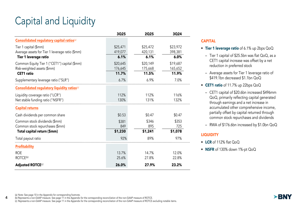 O BNY Mellon manteve uma forte posição de capital no 3º tri de 2025, com um índice de Ações ordinárias Tier 1 (CET1) de 11,7%, um aumento de 22 pontos base em relação ao trimestre anterior. O índice de alavancagem Tier 1 ficou em 6,1%, uma leve melhoria de 2 pontos base trimestre a trimestre. As métricas de liquidez permaneceram sólidas com um Índice de Cobertura de Liquidez (LCR) de 112% e um Índice de Financiamento Estável Líquido (NSFR) de 130%.
