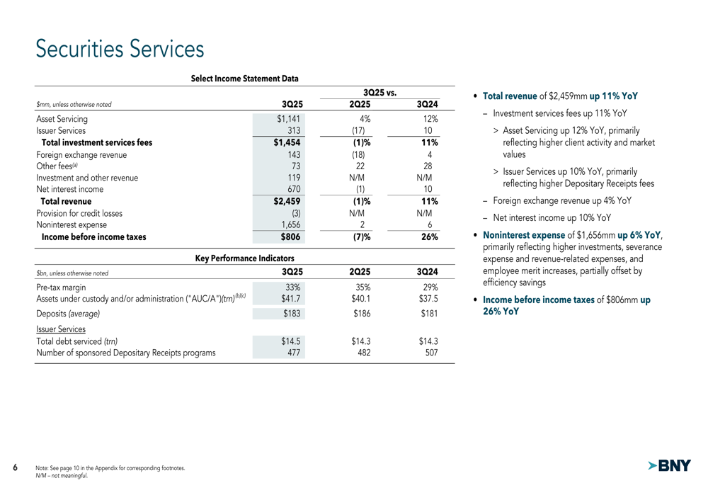 O segmento de Serviços de Valores Mobiliários, que inclui Serviços de Ativos e Serviços de Emissores, reportou receita total de US$ 2,46 bilhões, um aumento de 11% ano a ano. O lucro antes dos impostos para este segmento disparou 26% para US$ 806 milhões, refletindo forte eficiência operacional: