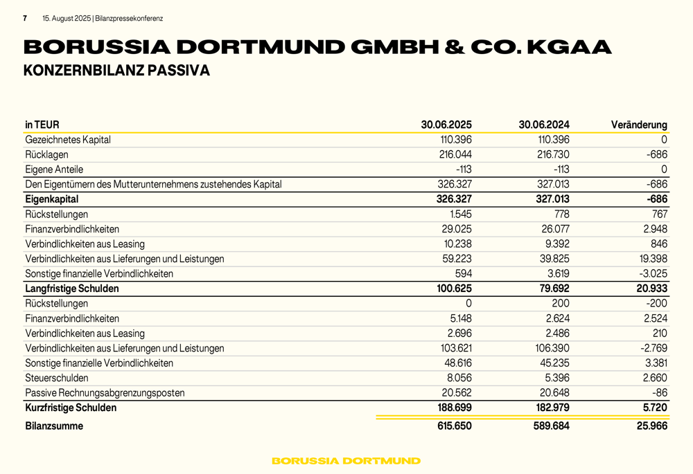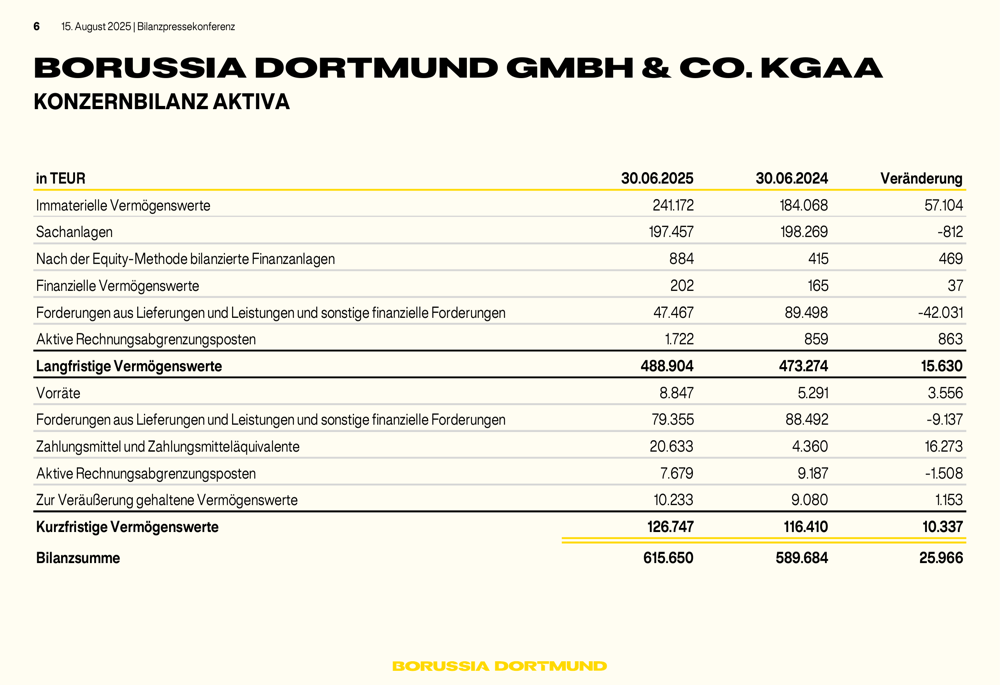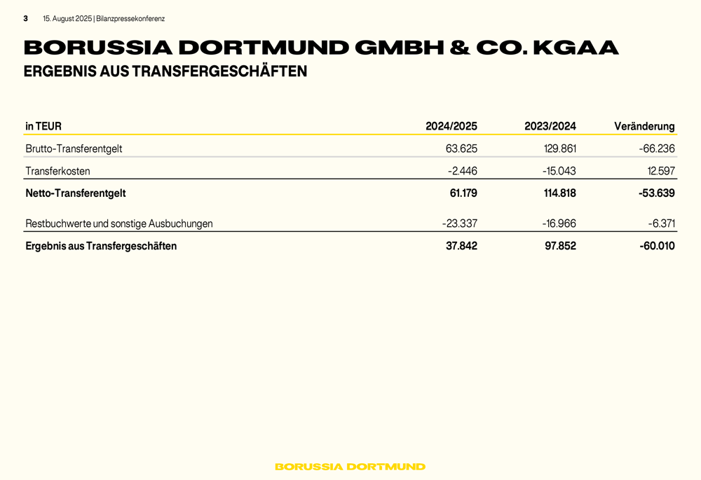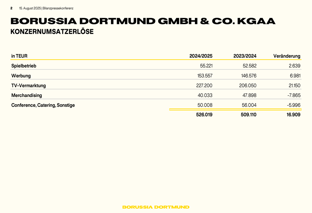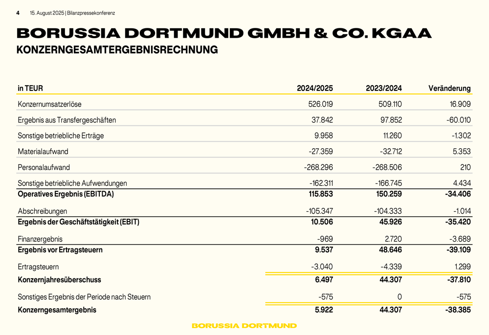 O Borussia Dortmund reportou uma receita consolidada de €526,02 milhões para o ano fiscal 2024/2025, representando um aumento de 3,3% em relação aos €509,11 milhões do ano anterior. No entanto, o lucro líquido consolidado despencou 85,3% para €6,50 milhões, abaixo dos €44,31 milhões em 2023/2024, principalmente devido a uma queda acentuada nos ganhos com transferências.