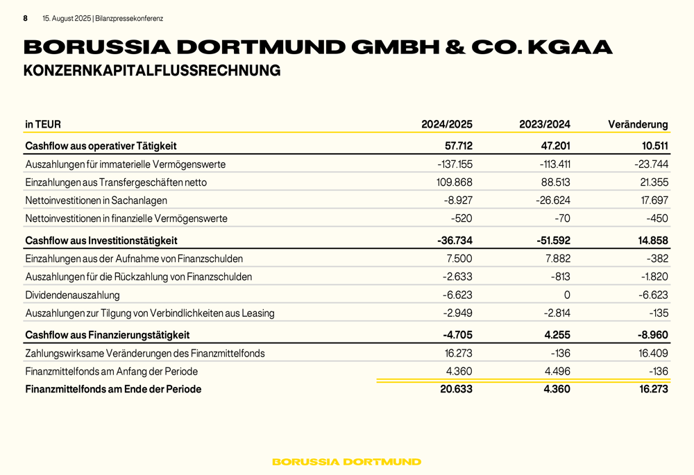 Apesar da queda no lucro, o Borussia Dortmund fortaleceu sua posição financeira com liquidez melhorada e investimentos estratégicos. A demonstração de fluxo de caixa consolidada revela melhorias significativas na gestão de caixa: