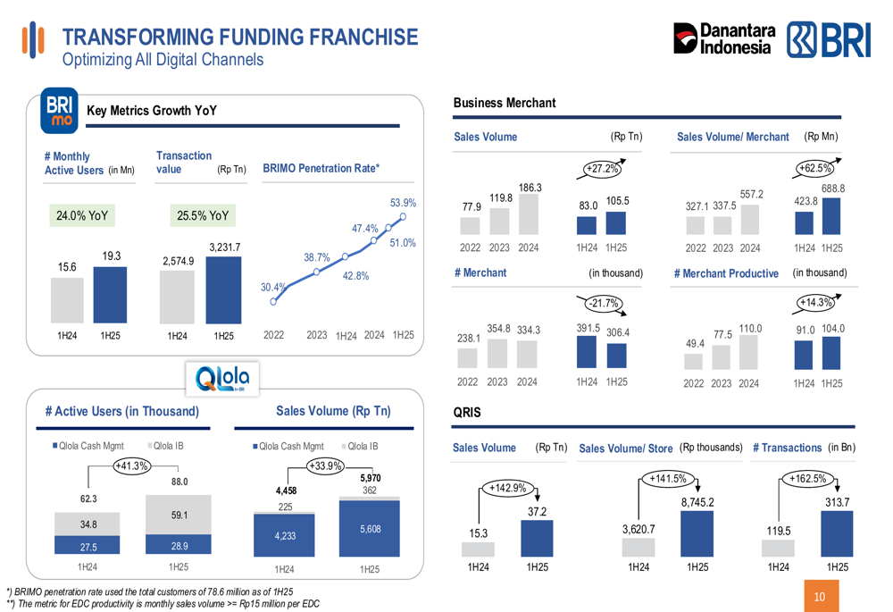 Um destaque importante da apresentação do BRI foi o forte desempenho de seus canais digitais, que continuam mostrando crescimento robusto apesar dos ventos contrários econômicos. A plataforma de mobile banking do banco, Brimo, alcançou 19,3 milhões de usuários ativos, representando crescimento de 24% na comparação anual, enquanto o valor das transações aumentou 25,5% para 3.231,7 trilhões de rúpias.