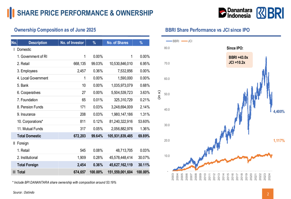 As ações do banco mostraram um desempenho notável de longo prazo, superando significativamente o mercado mais amplo. Como ilustrado no gráfico a seguir, as ações BBRI aumentaram 4.400% desde seu IPO, em comparação com o ganho de 1.117% do Índice Composto de Jacarta no mesmo período: