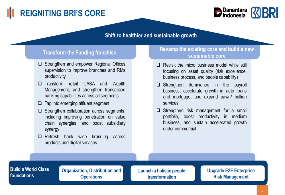 O BRI delineou uma estratégia abrangente focada na transformação de sua franquia de captação e na reformulação de seu modelo de negócios principal. O banco está particularmente focado no fortalecimento da gestão de riscos, no aprimoramento das competências dos oficiais de crédito e na melhoria da eficiência operacional.