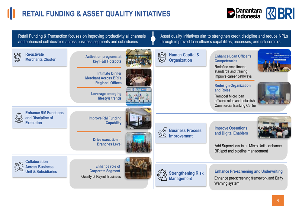 Para abordar preocupações com a qualidade dos ativos, o BRI implementou várias iniciativas destinadas a fortalecer a disciplina de crédito e reduzir empréstimos inadimplentes. Estas incluem o aprimoramento das competências dos oficiais de crédito, redesenho de funções organizacionais, melhoria das operações com facilitadores digitais e fortalecimento da gestão de riscos.