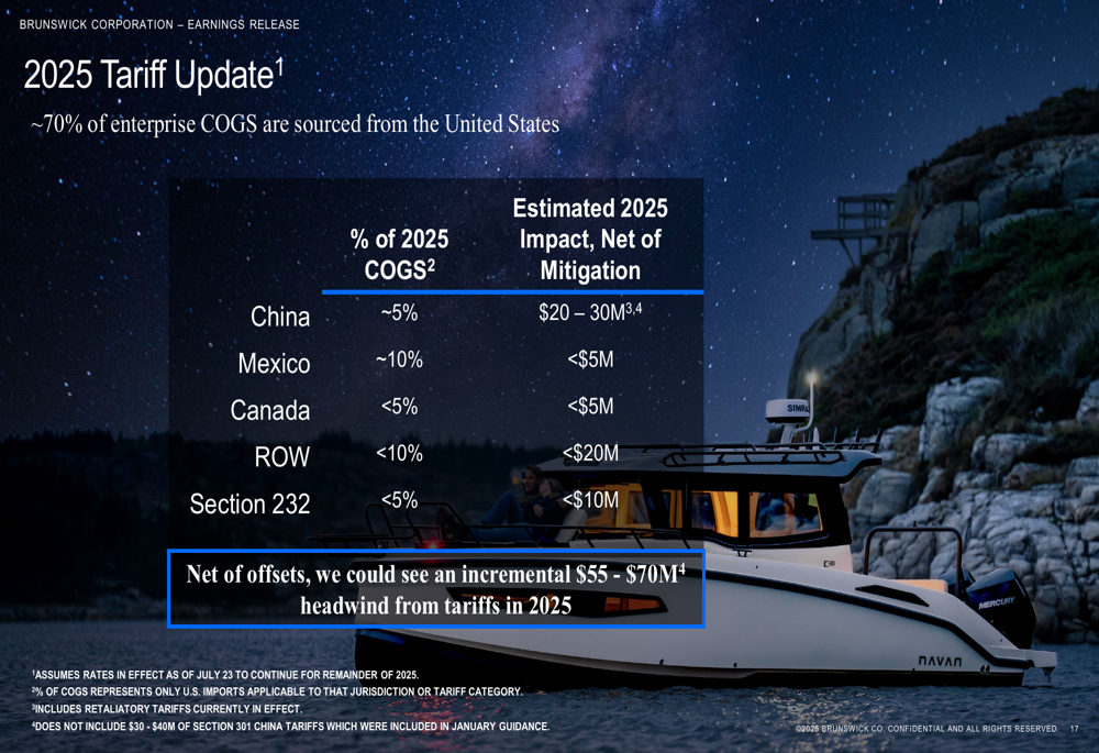 Um foco importante da apresentação da Brunswick foi o impacto das tarifas em seus negócios. A empresa forneceu um detalhamento detalhado do potencial impacto das tarifas em 2025, estimando um impacto líquido de US$ 55-70 milhões após os esforços de mitigação.