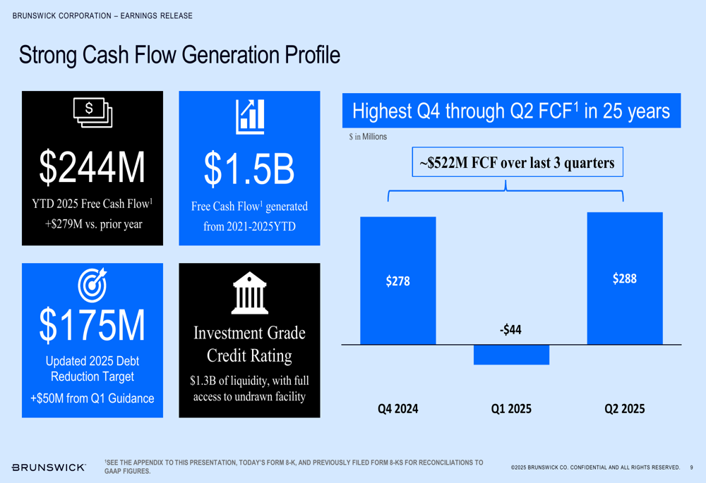 O desempenho do fluxo de caixa da Brunswick foi um destaque nos resultados do 2º tri, com a empresa gerando um fluxo de caixa livre recorde tanto para o trimestre quanto para o primeiro semestre do ano. Essa forte geração de caixa permitiu à Brunswick aumentar sua meta de redução de dívida para 2025 para US$ 175 milhões, um aumento de US$ 50 milhões em relação à orientação anterior.