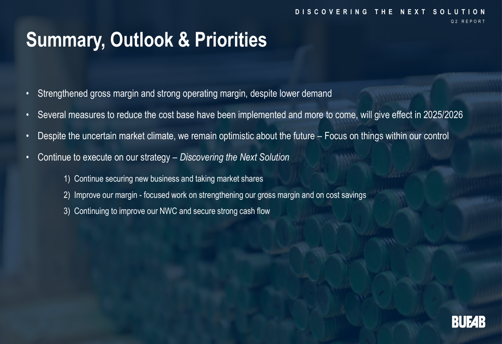 "Continuamos a fortalecer nossa margem bruta, e também entregamos uma forte margem operacional apesar da menor demanda no mercado," disse Erik Lundén, Presidente e CEO da Bufab, destacando o foco da empresa na lucratividade em meio a condições desafiadoras.