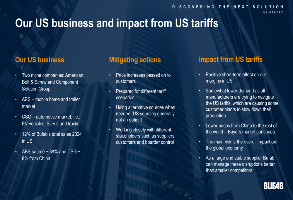 O negócio da Bufab nos EUA, que representa aproximadamente 12% das vendas totais, foi impactado por tarifas, mas implementou várias ações mitigadoras, incluindo aumentos de preços, preparação para diferentes cenários tarifários e uso de fornecimento alternativo quando necessário.
