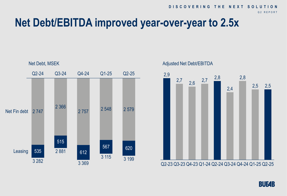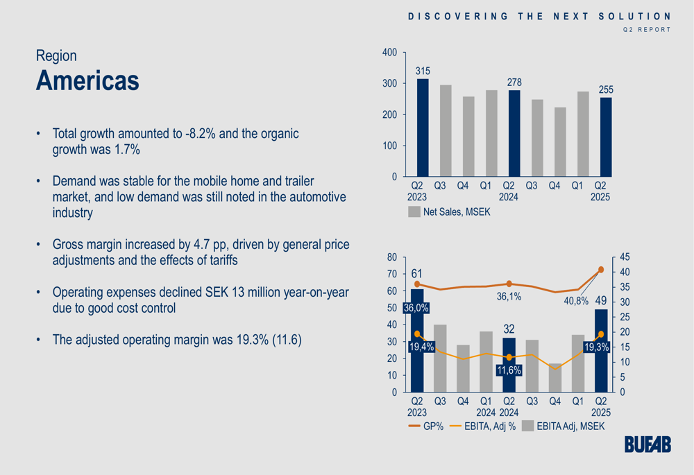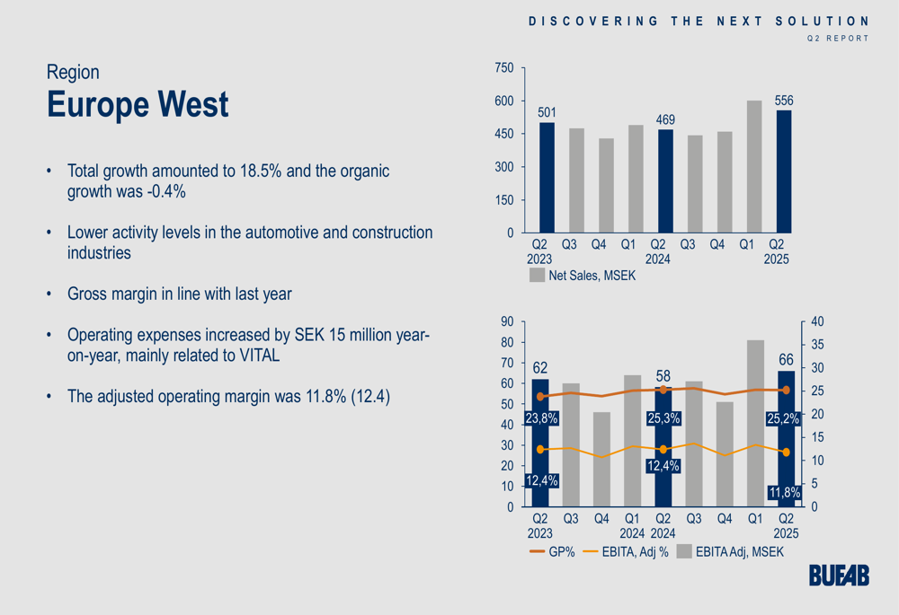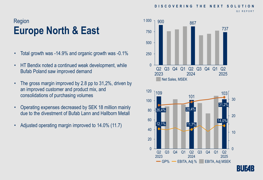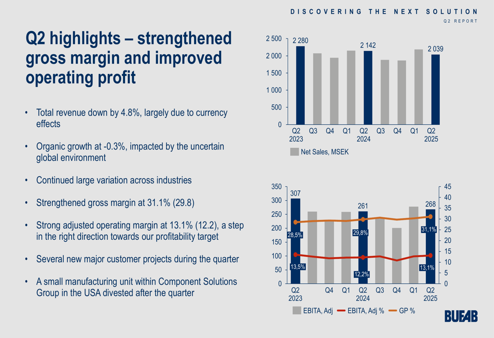 A Bufab reportou uma receita total de SEK 2.039 milhões para o 2º tri de 2025, uma queda de 4,8% em comparação com o mesmo período do ano anterior, principalmente devido a efeitos cambiais. O crescimento orgânico foi ligeiramente negativo em -0,3%, refletindo variação contínua entre indústrias e mercados.