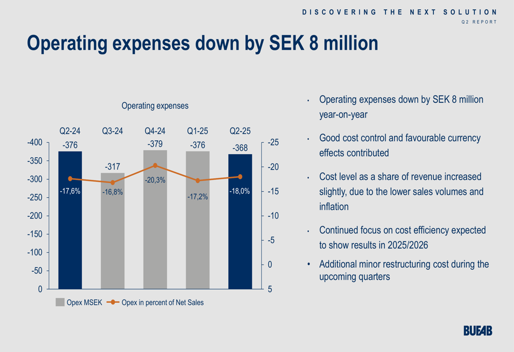 As despesas operacionais da empresa diminuíram em SEK 8 milhões em relação ao ano anterior, refletindo bom controle de custos e efeitos cambiais favoráveis. No entanto, o nível de custos como participação na receita aumentou ligeiramente para 18,0% de 17,6%, devido a volumes de vendas mais baixos e inflação.
