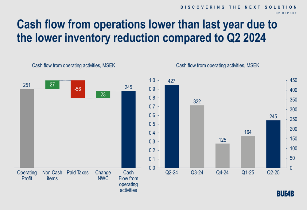 O fluxo de caixa das operações atingiu SEK 245 milhões, menor que os SEK 427 milhões reportados no 2º tri de 2024, principalmente devido a uma redução menor de estoque em comparação com o ano anterior.