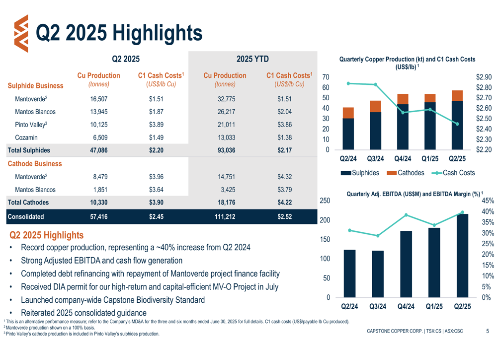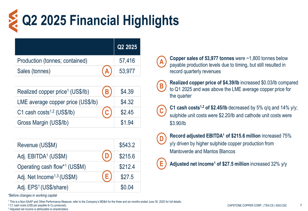 A Capstone reportou produção recorde de cobre de 57.416 toneladas no 2º tri de 2025, elevando a receita para US$ 543,2 milhões. A empresa alcançou EBITDA ajustado de US$ 215,6 milhões, representando um aumento significativo de 75% em comparação ao ano anterior. Os custos C1 diminuíram para US$ 2,45/lb, queda de 5% em relação ao trimestre anterior e 14% em comparação ao ano anterior, refletindo melhorias operacionais na maioria de suas minas.