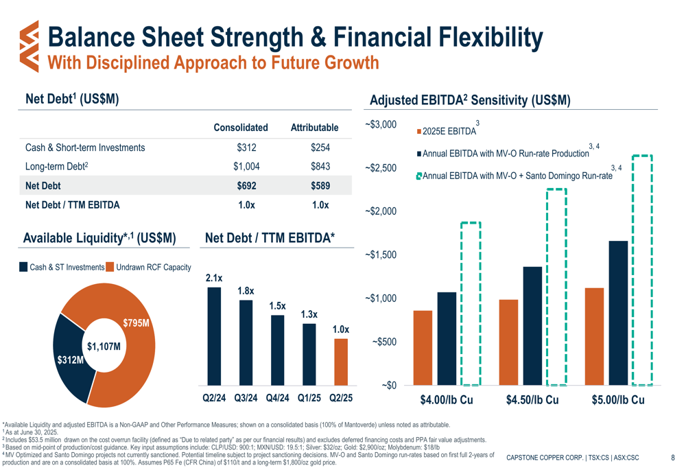 A Capstone fortaleceu sua posição financeira, reportando dívida líquida consolidada de US$ 692 milhões em 30 de junho de 2025, representando uma relação Dívida líquida/EBITDA dos últimos 12 meses de 1,0x. A empresa concluiu um refinanciamento da dívida com o pagamento do financiamento do projeto Mantoverde e agora possui liquidez disponível de US$ 1.107 milhões.