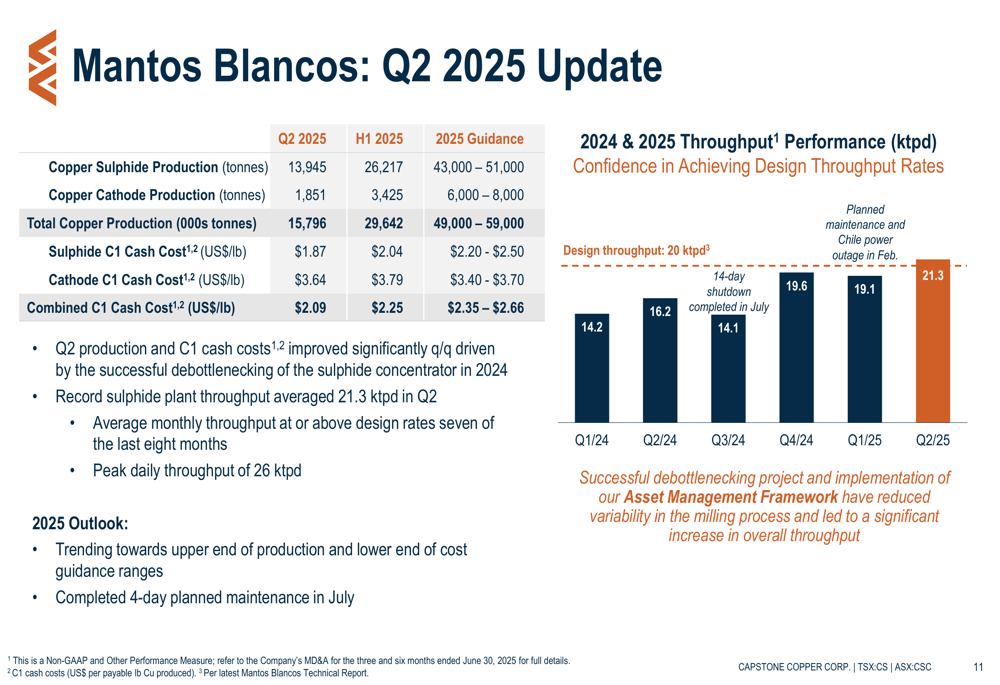 Mantos Blancos também entregou resultados sólidos, com produção total de cobre de 15.796 toneladas no 2º tri de 2025 e custos C1 combinados de US$ 2,09/lb. A operação alcançou processamento recorde na planta de sulfetos, com média de 21,3 ktpd, e está tendendo para o limite superior da orientação de produção e limite inferior da orientação de custos para 2025.