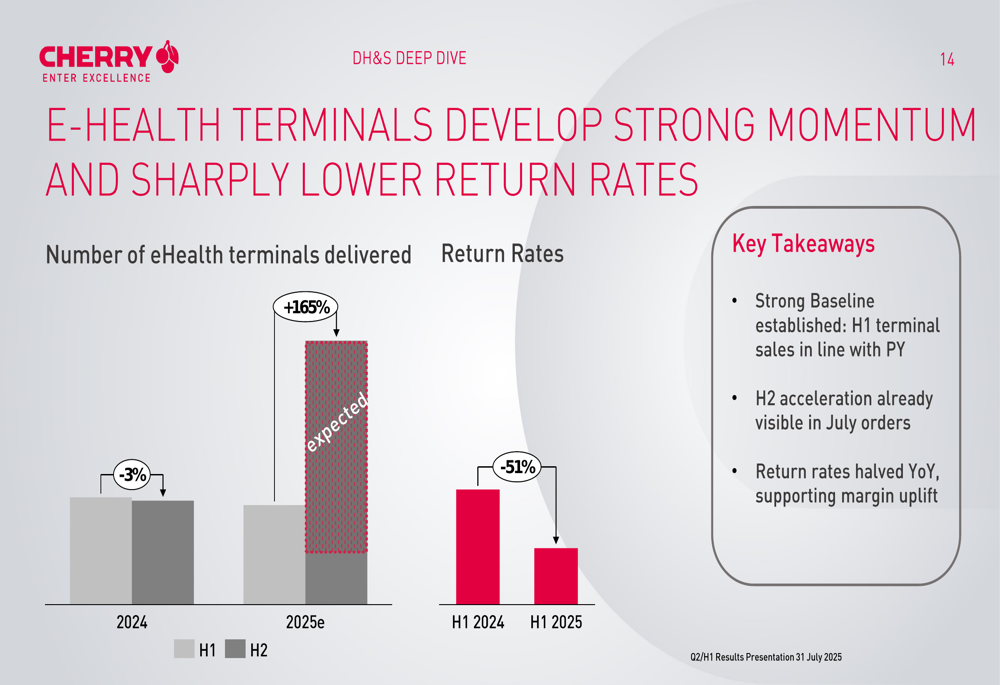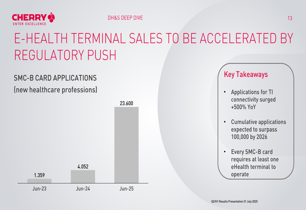 O segmento DH&S destaca-se como a unidade de negócios mais promissora da Cherry. As vendas de terminais de saúde eletrônica aceleraram devido a requisitos regulatórios, com as solicitações de cartões SMC-B aumentando 500% em relação ao ano anterior, chegando a 23.600 em junho de 2025, comparado a apenas 4.052 em junho de 2024.