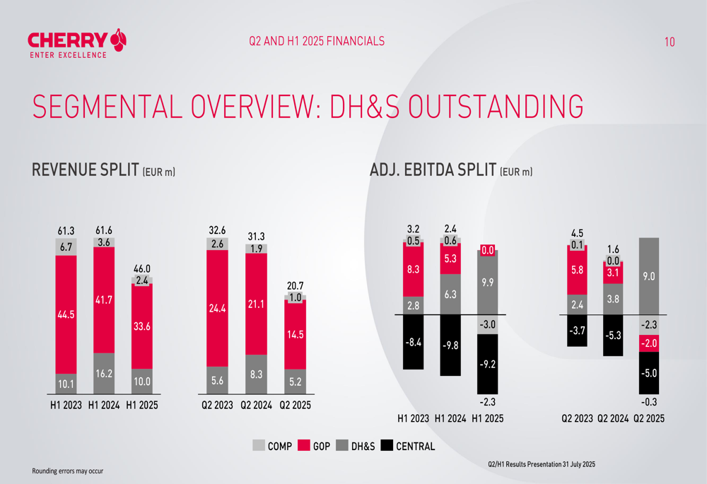 A análise segmentada revela diferenças marcantes no desempenho entre as unidades de negócio da Cherry. Enquanto o segmento DH&S manteve forte lucratividade com um EBITDA ajustado de €9,9 milhões no primeiro semestre de 2025, os segmentos de Componentes (COMP) e Periféricos para Gaming/Escritório (GOP) lutaram para gerar resultados positivos.