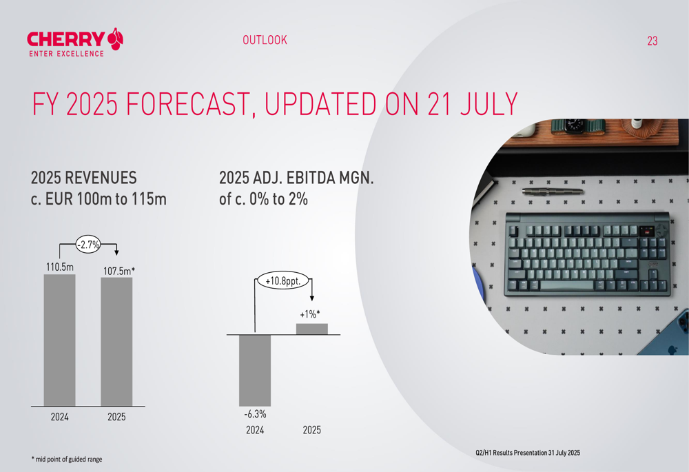 Para o ano completo de 2025, a Cherry prevê receita de aproximadamente €100-115 milhões com uma margem EBITDA ajustada de 0-2%, representando uma melhoria significativa em relação à margem de -6,3% de 2024.