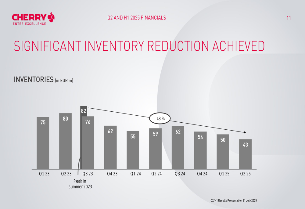 A Cherry fez progressos significativos na redução dos níveis de estoque, que atingiram o pico de €82 milhões no verão de 2023 e desde então foram reduzidos em 48% para €43 milhões no 2º tri de 2025. Essa redução foi impulsionada por uma rede de parceiros realinhada, identificação de canais de distribuição equilibrados e redução de SKUs.