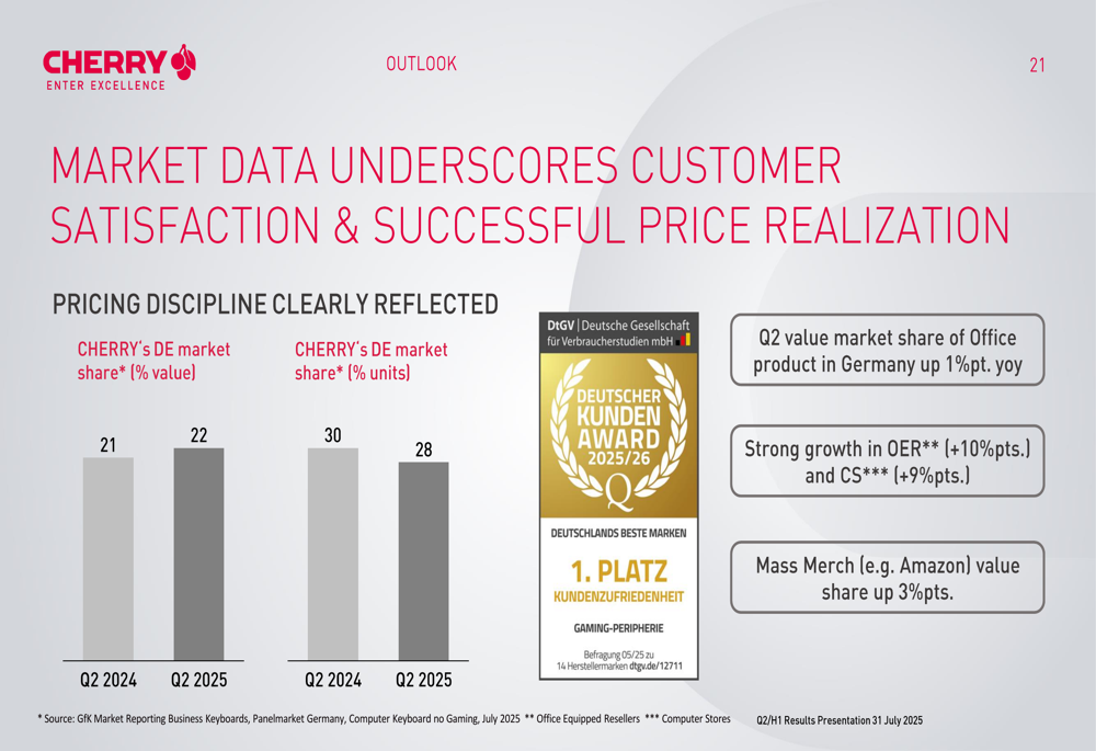 Apesar dos desafios gerais do mercado, a Cherry manteve sua posição de mercado na Alemanha, com sua participação de mercado em valor aumentando 1 ponto percentual em relação ao ano anterior, chegando a 22% no 2º tri de 2025, embora sua participação em unidades tenha diminuído ligeiramente de 30% para 28%.