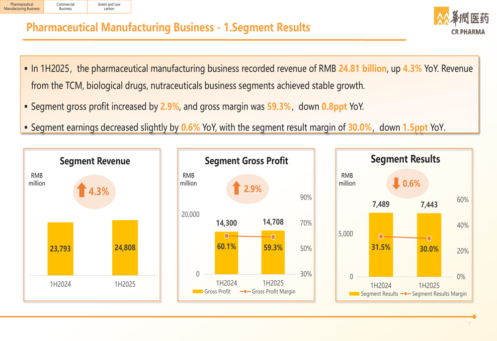 O segmento de fabricação farmacêutica, um importante impulsionador da lucratividade, entregou um crescimento de receita de 4,3% para RMB 24,81 bilhões. No entanto, os ganhos do segmento diminuíram ligeiramente em 0,6% ano a ano, com a margem de resultado do segmento caindo 1,5 pontos percentuais para 30,0%.