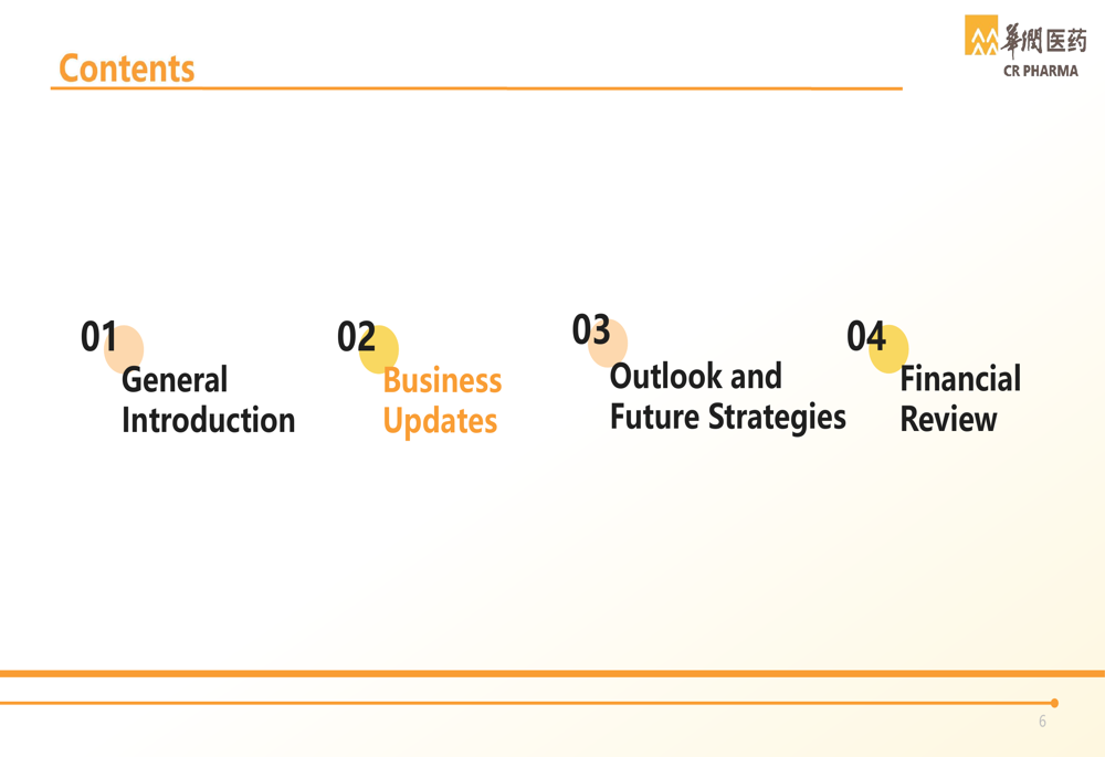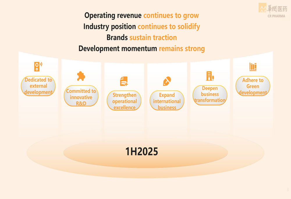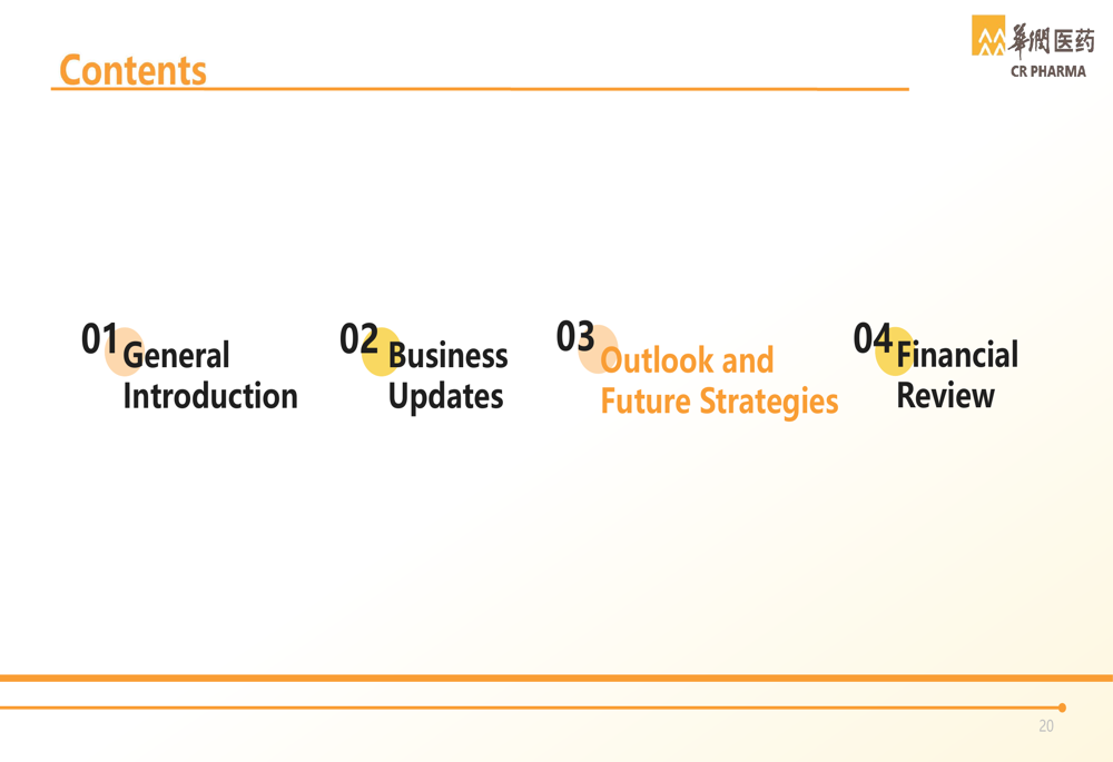 A apresentação destacou o foco contínuo da CR Pharmaceutical no desenvolvimento externo por meio de aquisições, investimentos em P&D e expansão para mercados internacionais, mesmo com sua linha de resultados enfrentando desafios em um ambiente de mercado cada vez mais competitivo.