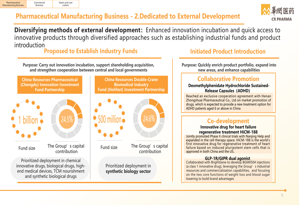 A empresa também propôs o estabelecimento de dois fundos da indústria: o China Resources Pharmaceutical (Chengdu) Innovation Investment Fund Partnership (RMB 1 bilhão, participação de 24,5%) e o China Resources Double-Crane Biomedical Industry Fund (Hohhot) Investment Partnership (RMB 500 milhões, participação de 24,6%). Esses fundos priorizarão investimentos em medicamentos inovadores, dispositivos médicos de ponta e biologia sintética.