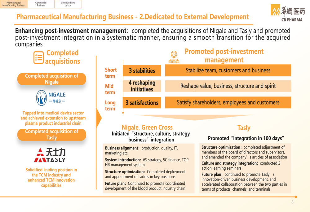 A CR Pharmaceutical continuou sua estratégia de desenvolvimento externo através de aquisições concluídas e do estabelecimento de fundos de investimento na indústria. A empresa finalizou aquisições da Nigale e Tasly, implementando estratégias de integração pós-aquisição focadas na estabilização de equipes, clientes e operações comerciais.
