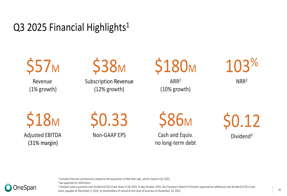 A OneSpan reportou receita de US$ 57 milhões no 3º tri de 2025, representando um modesto crescimento de 1% ano a ano. Embora tenha ficado ligeiramente abaixo dos US$ 58,18 milhões previstos, a receita de assinaturas da empresa mostrou forte impulso, aumentando 12% para US$ 38 milhões. A receita recorrente anual (ARR) atingiu US$ 180 milhões, um aumento de 10% em relação ao ano anterior, com uma taxa de retenção líquida de receita de 103%.