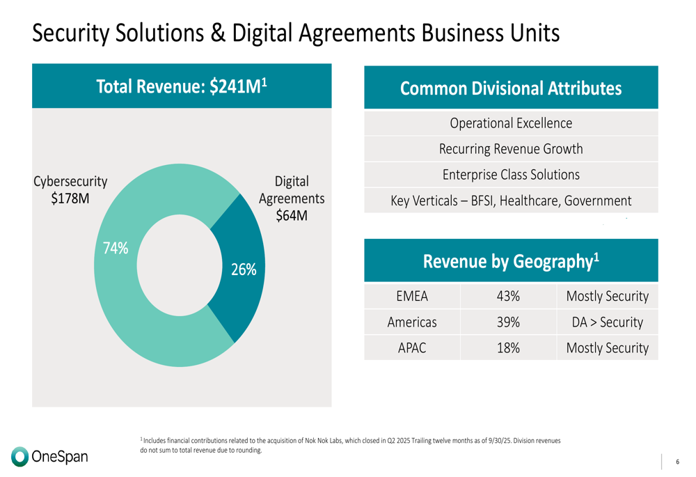 Para a divisão de Soluções de Segurança, a OneSpan destacou capacidades expandidas de autenticação sem senha FIDO2 e prevenção aprimorada de fraudes cibernéticas através de investimento com a ThreatFabric. A divisão de Acordos Digitais continua a aproveitar um modelo de "land and expand" com soluções corporativas importantes, incluindo assinaturas eletrônicas, verificação de identidade e ofertas complementares como formulários inteligentes, serviços de tabelionato remoto e armazenamento seguro.
