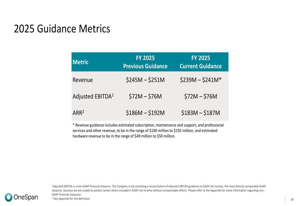 Em uma atualização significativa, a OneSpan revisou para baixo suas projeções para o ano completo de 2025, tanto para receita quanto para ARR, mantendo suas metas de EBITDA ajustado. A empresa agora espera receita entre US$ 239-241 milhões, abaixo da projeção anterior de US$ 245-251 milhões. Da mesma forma, as expectativas de ARR foram reduzidas para US$ 183-187 milhões, ante o intervalo anterior de US$ 186-192 milhões. No entanto, a projeção de EBITDA ajustado permaneceu inalterada em US$ 72-76 milhões.