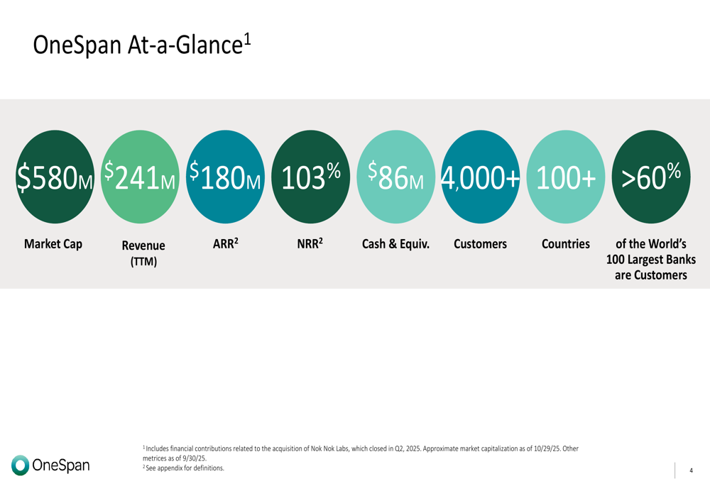 A OneSpan continua a se posicionar como parceira de segurança confiável para empresas globais, particularmente no setor bancário. A empresa atende mais de 4.000 clientes em mais de 100 países, com mais de 60% dos 100 maiores bancos do mundo entre sua base de clientes.