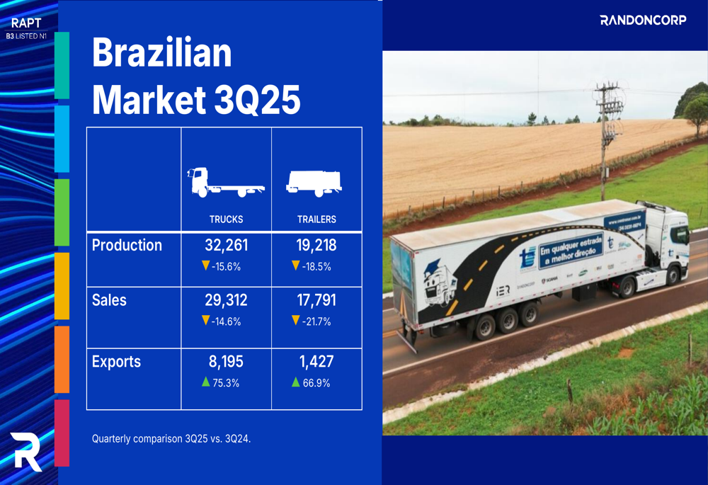 O mercado brasileiro de caminhões e reboques continuou sua tendência de queda, com a produção de caminhões caindo 15,6% e a produção de reboques diminuindo 18,5% em comparação ao mesmo período do ano passado. No entanto, a Randoncorp conseguiu compensar parcialmente esses desafios domésticos por meio de forte crescimento internacional e aquisições estratégicas.