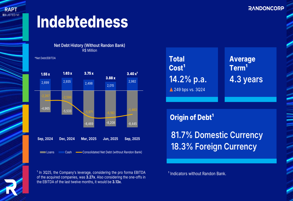 O balanço da Randoncorp mostrou sinais de crescente pressão, com a relação Dívida líquida/EBITDA mais que dobrando de 1,55x em setembro de 2024 para 3,40x em setembro de 2025. O custo total da dívida aumentou 249 pontos base para 14,2% ao ano, refletindo o ambiente de taxas de juros mais altas.