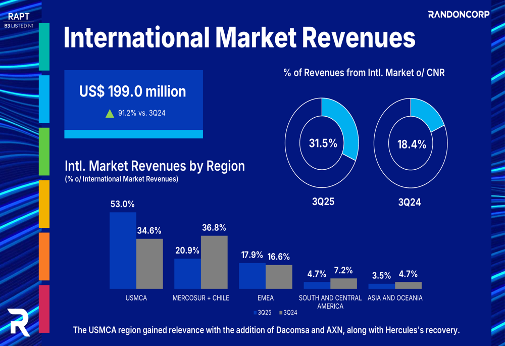 O ponto mais positivo nos resultados do 3º tri da Randoncorp foi seu desempenho internacional. A receita de mercados internacionais disparou 91,2% para US$ 199 milhões, agora representando 31,5% da receita líquida consolidada, comparado a apenas 18,4% no 3º tri 2024.