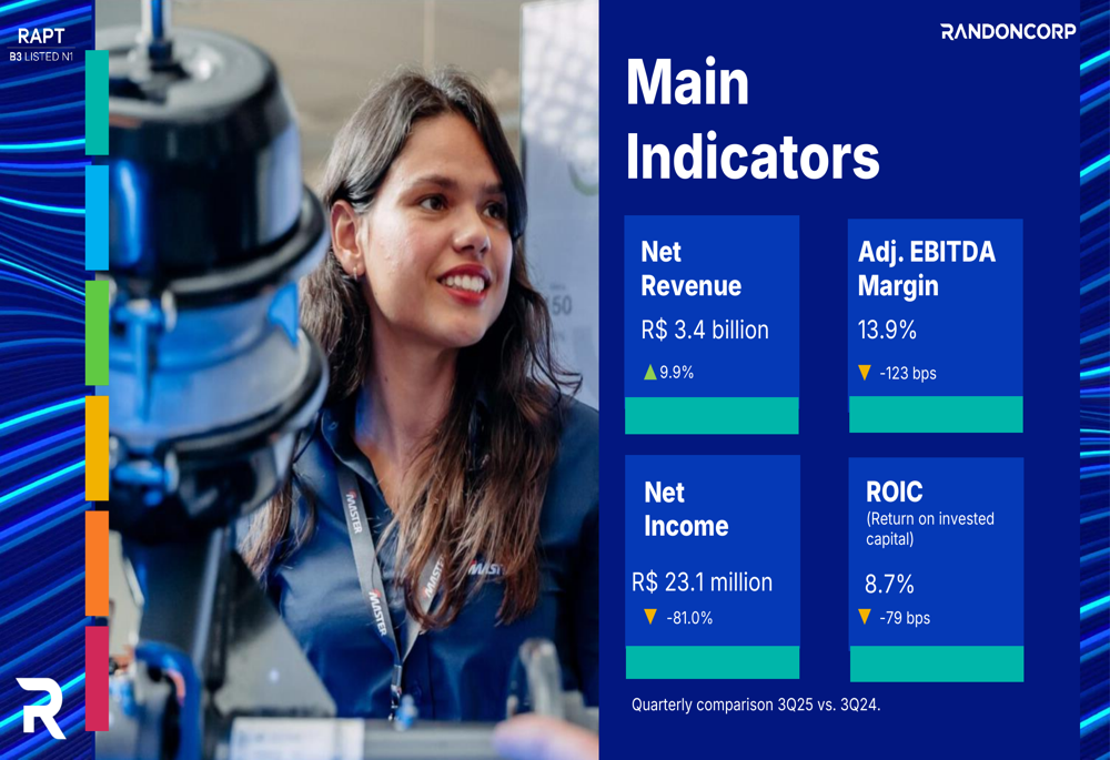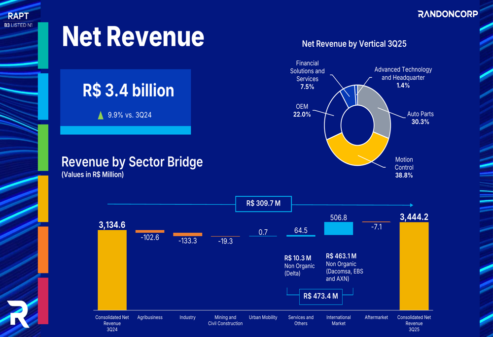 A Randoncorp reportou receita líquida de R$ 3,4 bilhões no 3º tri 2025, representando um aumento de 9,9% em comparação ao 3º tri 2024. Este crescimento ocorreu apesar dos ventos contrários no mercado doméstico, já que a estratégia de expansão internacional da empresa e aquisições recentes impulsionaram o desempenho da receita.