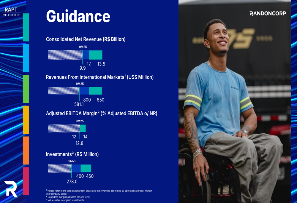 O guidance da Randoncorp para os primeiros nove meses de 2025 mostrou resultados mistos em relação às metas. A receita líquida consolidada de R$ 9,9 bilhões ficou abaixo da faixa de orientação de R$ 12-13,5 bilhões. Da mesma forma, as receitas do mercado internacional de US$ 581,1 milhões ficaram abaixo da meta de US$ 800-850 milhões. No entanto, a margem EBITDA ajustada de 12,8% estava dentro da faixa projetada de 12-14%.