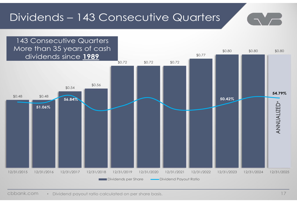 O banco também manteve um forte compromisso com os retornos aos acionistas através de pagamentos consistentes de dividendos. Como mostrado no gráfico a seguir, a CVB Financial aumentou seu dividendo de US$ 0,48 por ação em 2015 para US$ 0,80 por ação em 2025, mantendo um índice de distribuição prudente: