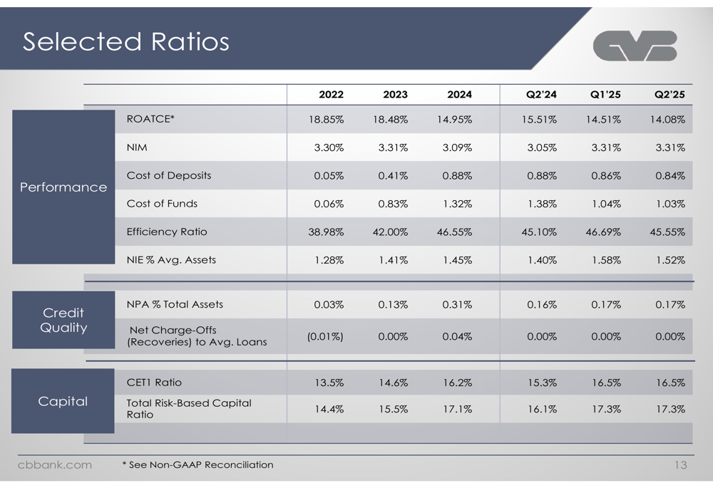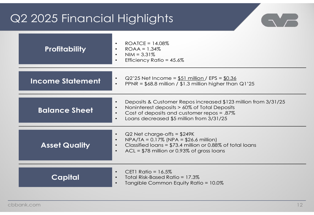 A CVB Financial reportou lucro líquido de US$ 50,6 milhões para o 2º tri de 2025, traduzindo-se em lucro por ação de US$ 0,36, consistente com o mesmo trimestre do ano anterior. O banco manteve fortes métricas de rentabilidade com retorno sobre o patrimônio líquido tangível médio (ROATCE) de 14,08% e retorno sobre ativos médios (ROAA) de 1,34%.