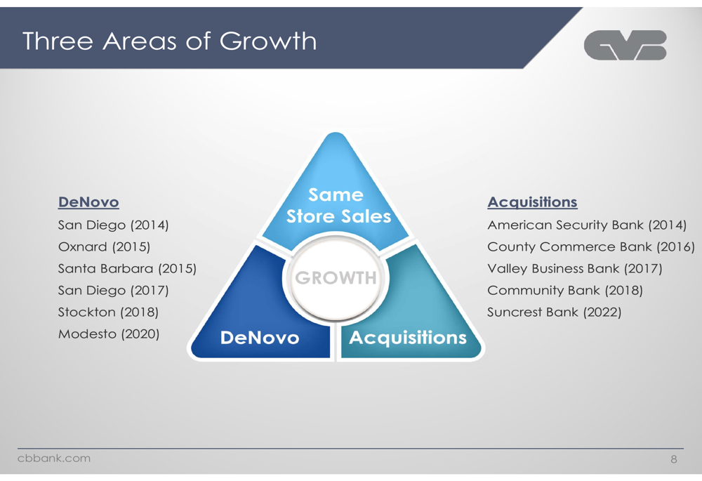 O banco persegue três estratégias primárias de crescimento: abertura de novas localidades (DeNovo), aumento das vendas nas mesmas lojas e aquisições estratégicas. Locais recentes de DeNovo incluem San Diego (2014, 2017), Oxnard (2015), Santa Barbara (2015), Stockton (2018) e Modesto (2020). A estratégia de aquisição do banco visa instituições financeiras com US$ 1-10 bilhões em ativos tanto em mercados existentes quanto novos.